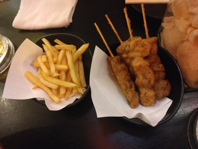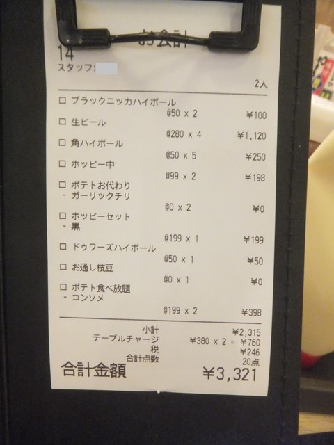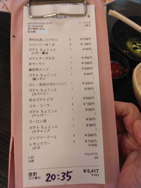 お会計は20:10頃にお願いして、20:35頃に出ました。総額5417円。これで二人分なので安さが分かるというもの。今回は定番のスパイシー串とポテトにつまみ物を挟みつつ頂きました。