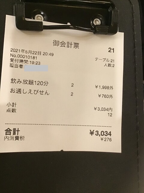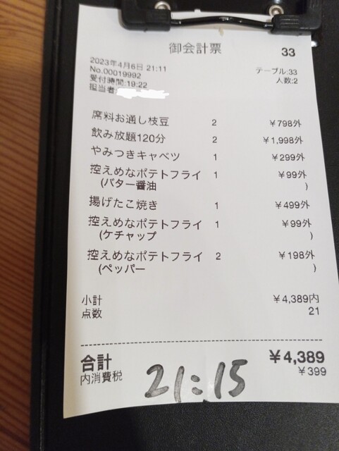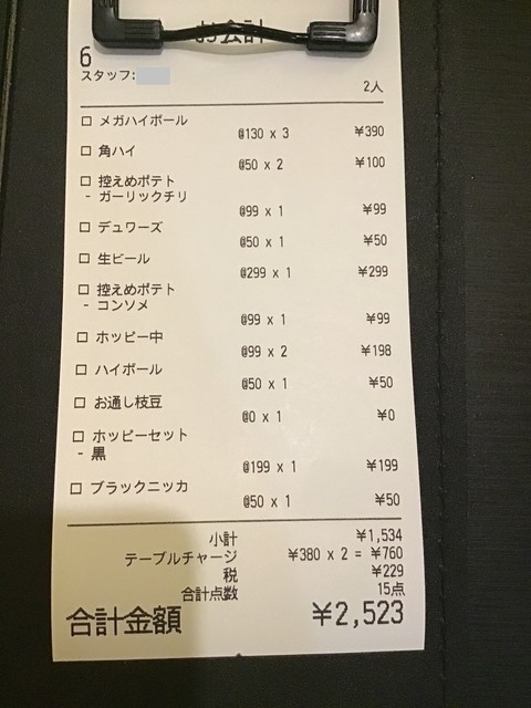 2時間20分程度の滞在で食べて飲んで一人辺り2200円程度