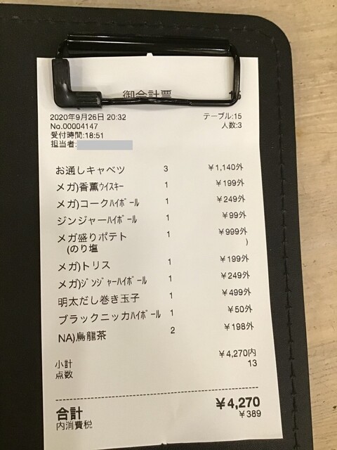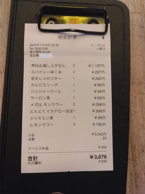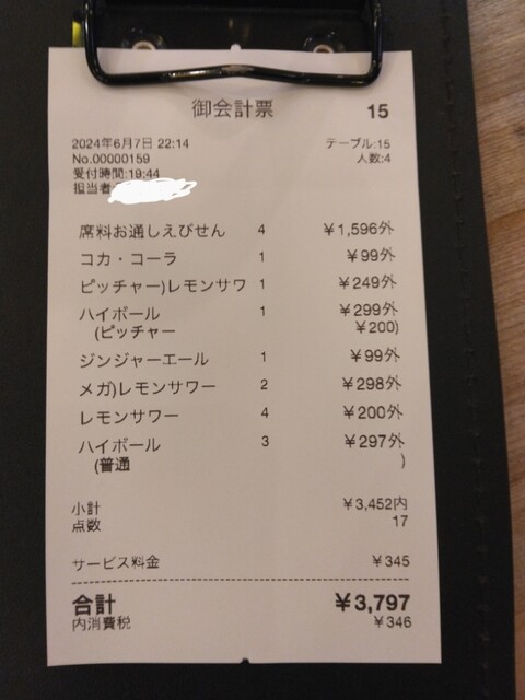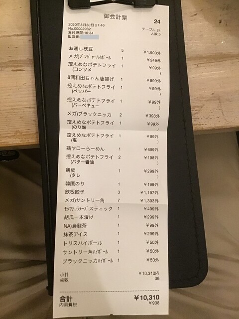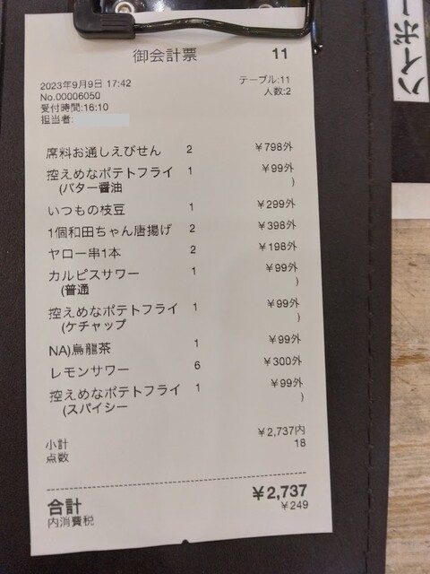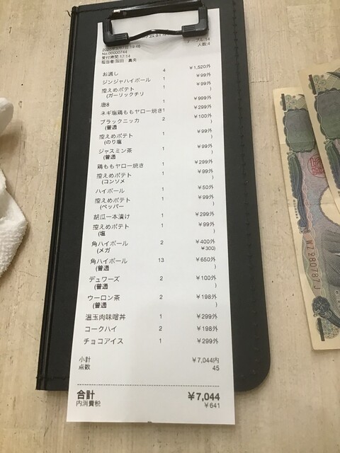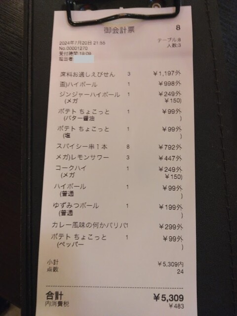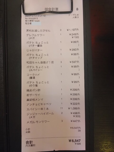 伝票、これだけ食べ飲みして一人2200円は安い!(2024.8.31)