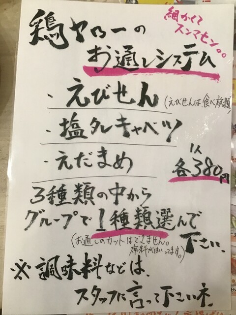 席料なので、お通しそのものはあんまり期待してはいけません。3種類選べるお通しの中でえびせんだけがお替り自由です。沢山食べたいならば、えびせん一択です。