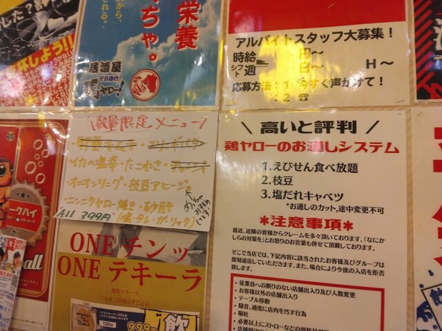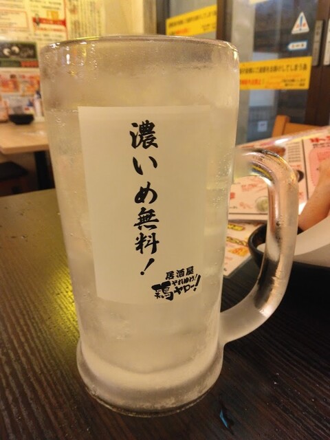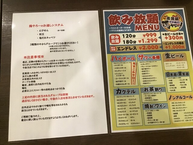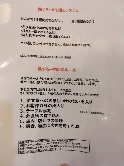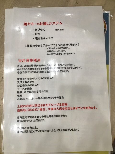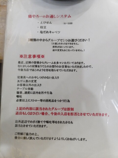 二日連続の鶏ヤロー!さんです。友人の某崎&レスラーとの来店です。安い事とタバコ吸える事が決め手になりました。愛煙家の某崎には是非とも禁煙して欲しい・・・。土曜日19:06の来店で、店内かなり空いていました。入店時の注意事項の説明や同意など面倒くさい事が多くなったので、敬遠しているお客さんが多くなった?とはK兄の談ですが、時間が遅くなると満席になってくるスロースターターなお店だったりします。