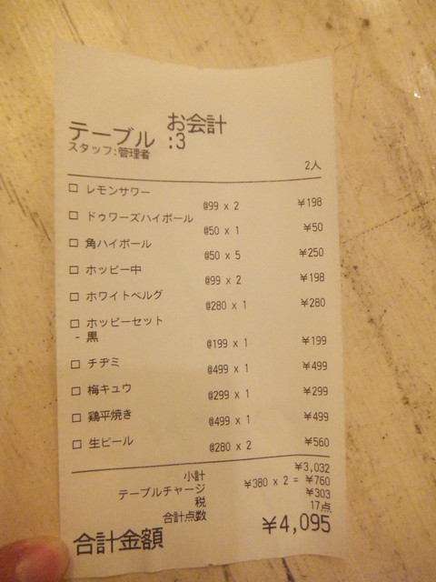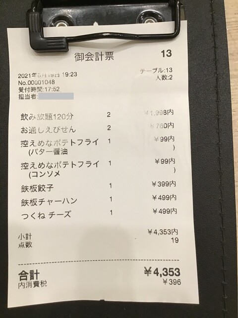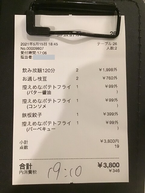 3時間弱、飲みメインでちょっと食べて一人辺り1770円程度