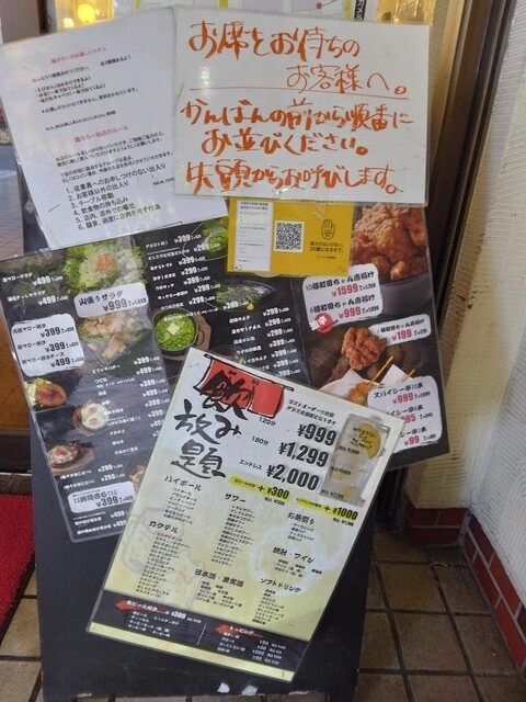 友人のK兄、レスラーと3人で利用しました。土曜日19:11の来店で店内はザワザワしていましたが、まだ比較的席は余裕がありました。入店の際に少し待たされましたが・・・。このお店、入店時の ”誓い” が結構面倒くさいです。また、丁度入店ラッシュとなってしまい、最初のオーダーが入るまでに少し待ち時間が発生してしまいました。