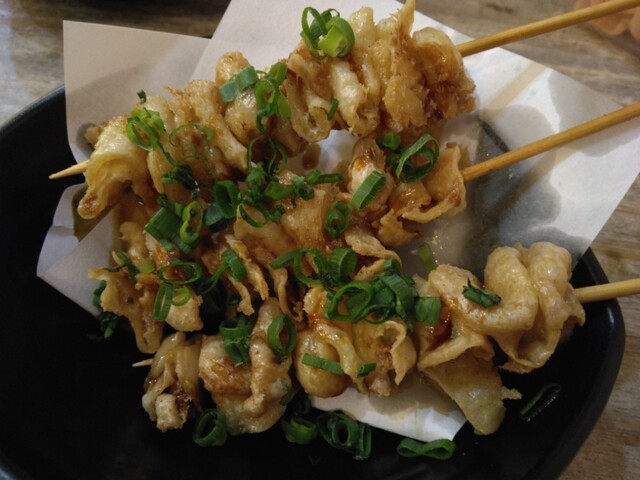 1本税込み109円はお安い!柔らか鶏もも肉(だと思う)が唐揚げっぽくなって串に刺さって登場です。異様に柔らかく食べやすい為、ものすごい勢いで無くなってしまいます。沢山頼んだからって安くはなりませんが、店員さんの手間を考えたら、一挙に沢山頼んでしまった方が良いかもしれません。