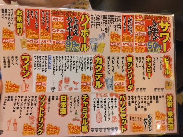 今回5杯のメガレモンサワーを飲みましたが、かなり酔って二日酔いになるまで追い込まれました。ノーマルレモンサワーが55円で、それが価格の上では3杯分で1リットル・・・になるそうです。800円ちょっとで翌日二日酔いになるまで酔えるなんて、これは安い!味わいは甘みを抑えたストロング気味なレモンサワーになっています。サッパリしてイイです。