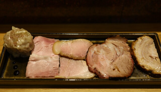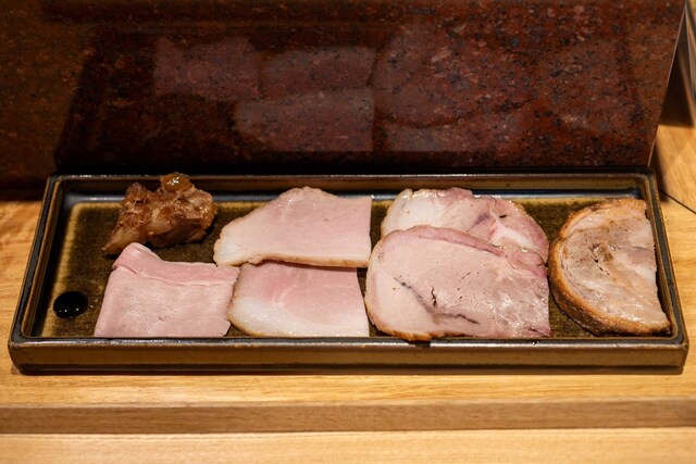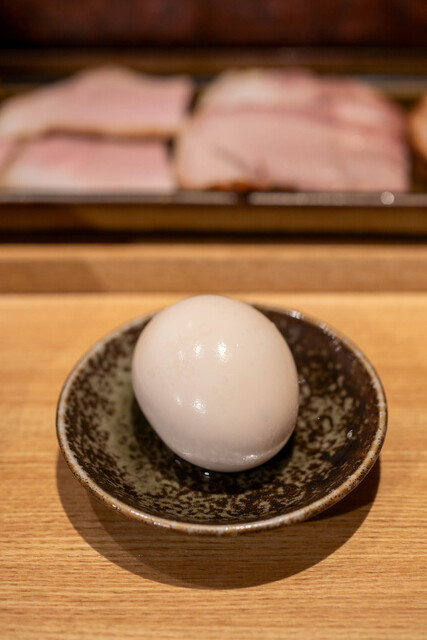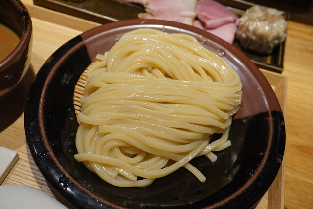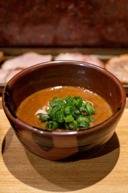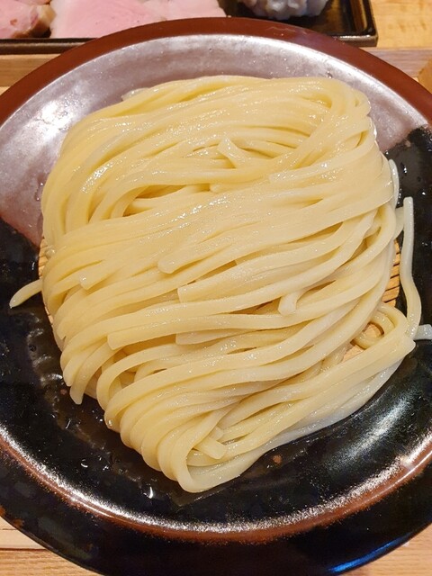 選りすぐりの全粒粉を使う自家製太ストレート麺は、褐色を纏い、見るからにどっしり、艶々として、硬さと密度感、もっちりした弾力、全てがパーフェクト。 噛みしめ、そして喉に落ちて行くたびに小麦の良い香りがします。 具材もそれぞれが旨く、拘って開発された上質なもの。 そして、これらを纏めるのが、濃厚極まる魚介豚骨つけ汁の、複雑で深みのある素晴らしい味わいですね。