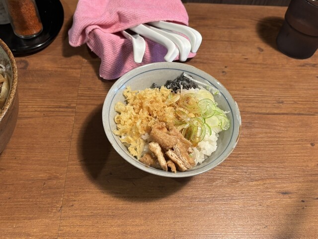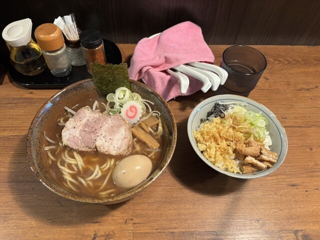 "中華そば 志の田"で"太麺中華そば 味玉付き"1,070円と"悪魔のたぬきつ丼"350円を頂きました。