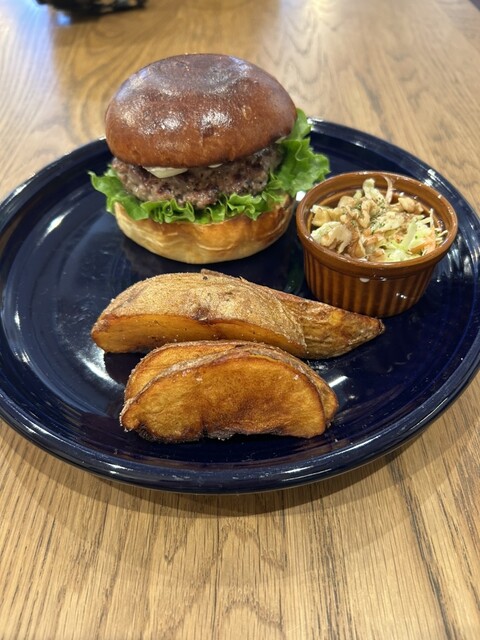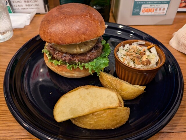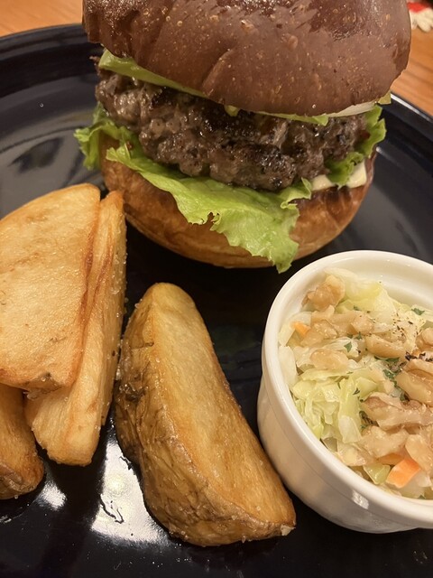 単品プラス200円でセットにできて、内容は、バーガーにフライドポテトと胡桃入りのコールスローがついてき...
