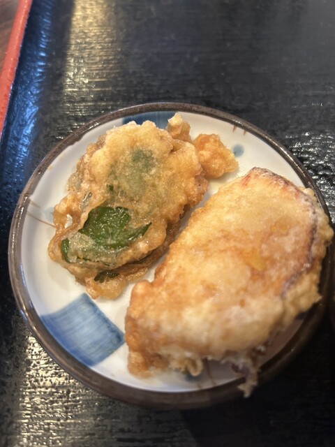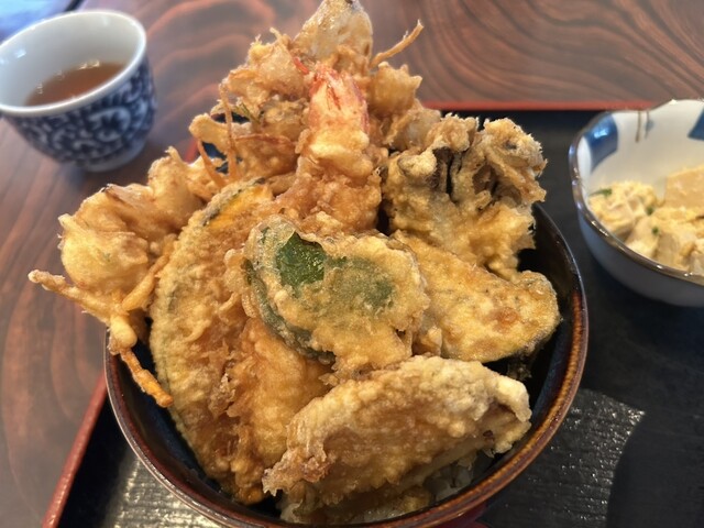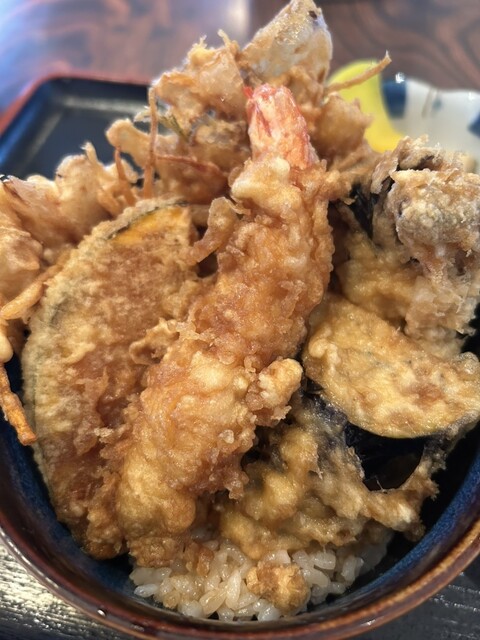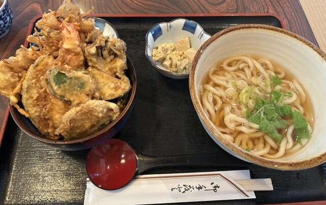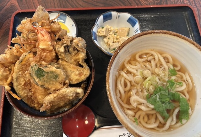 天丼とうどんのセットを注文したのですが、天丼の天ぷらの種類が多くてありがたいです。