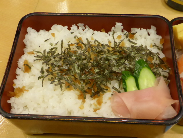 配膳されたのはお重が二重になってます。ご飯とネタ。ご飯の上にはわずかなかんぴょう巻きの破片とのり、ガリ。この海苔はまったく不要。まずくするだけの効果しかありませんので、どけます。