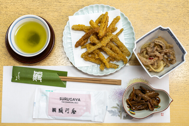 徳利やお猪口、重箱に至るまで「駿河」らしく「富士山」の図柄が施され、鰻に欠かせないお新香は同じく成田の老舗「鷹匠 漬物」謹製。