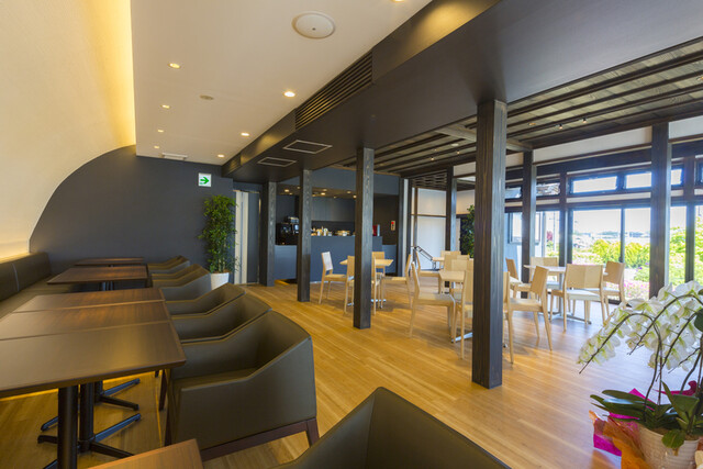 地元農家から借り受けた民家をリノベーションした佇まいで、店内は空港ラウンジを手掛けたデザイナー監修のもと、シンプルながらもあたたかみのあるモダンな空間を演出しています。窓から見える飛行機を眺めながら、ゆったりとした時間をお楽しみいただけます。