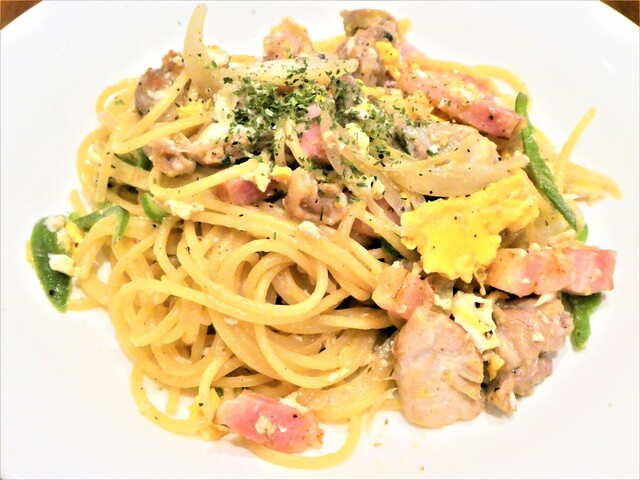①ベーコン・チキン・卵のミラノ風パスタ ¥980 外税
