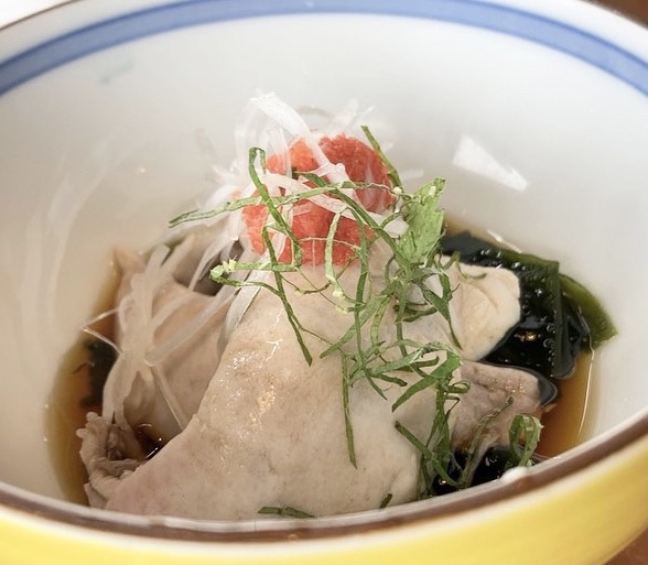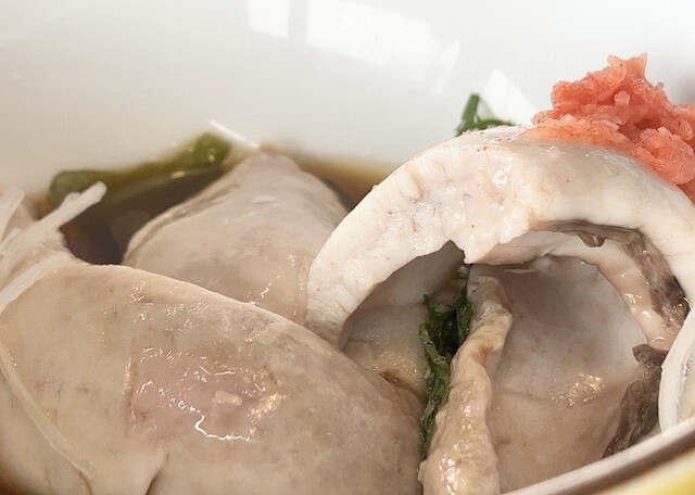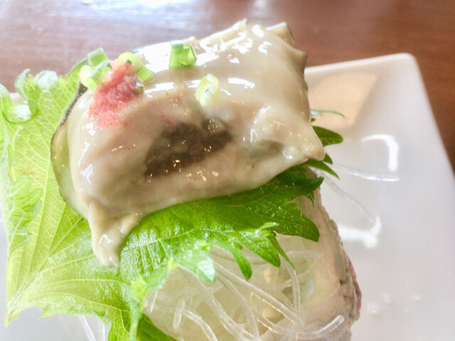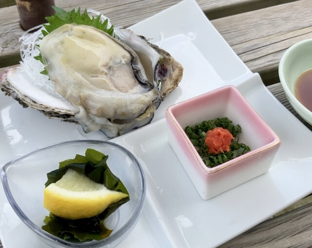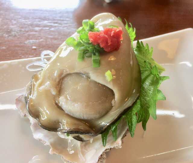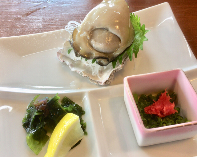 最初に岩牡蠣きました!ポン酢、多くない?と思ったんですが、岩牡蠣が分厚くて、一口じゃ収まらないんですよ(⌒-⌒; )付け合わせのワカメも美味しい。