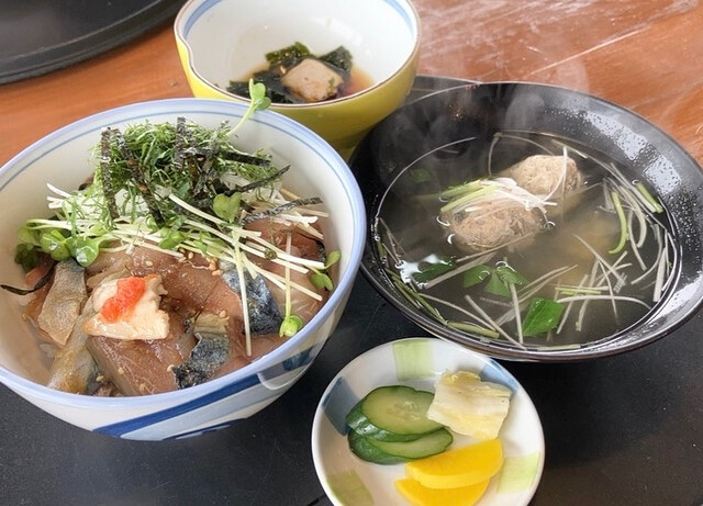 次に熱々のさばの団子汁、さばのお刺身、いわしの漬丼と続きます。いわしの漬丼は、白醤油かなあ?タレの味が濃くないから、いわしの美味しさが際立ちます。うんうん、いわしも身が厚くて美味しい(≧∀≦)さばの団子汁は、少し塩気が強いですが、臭みもなくgood(^ ^)