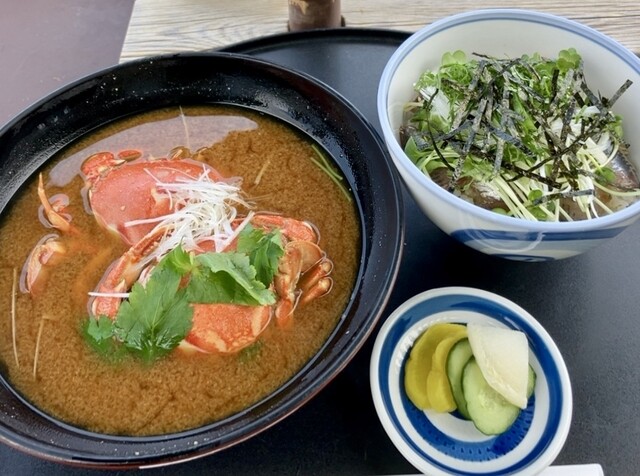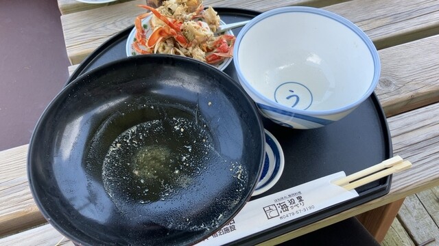 この日は磯かき、丸カニ味噌汁(900円)、いわしの漬丼を注文。丸カニが二匹もドーンと入ってるのは嬉しいけど、身をかきだすのがなかなか大変