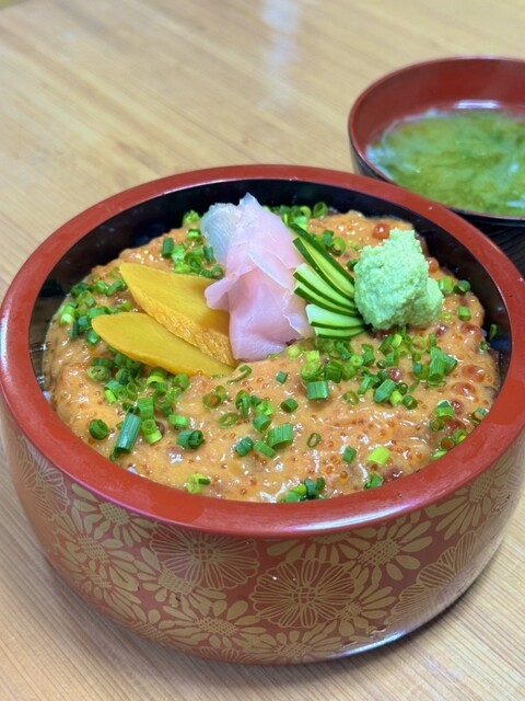 爆弾丼はペースト状になった雲丹、いくら、とびっことイカが入ったもの。なかなか見ない系の爆弾です。なめらかな口当たりですが食べ応えありました。