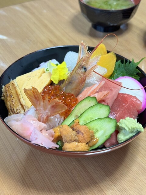 海水浴場、プールウォーターガーデン、蓮沼海浜公園より車で2分の場所なので、お越しの際は、立ち寄ってみてはいかがでしょうか。ねぎとろ、ウニ、いくら、とびっ子、いかを混ぜ合わせた、爆弾丼は、当店自慢の一品です。是非ご賞味下さい。