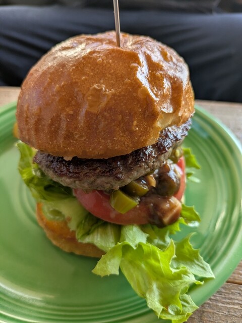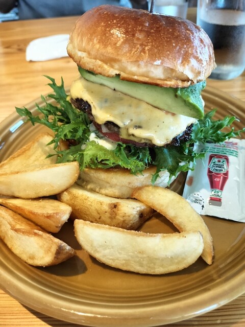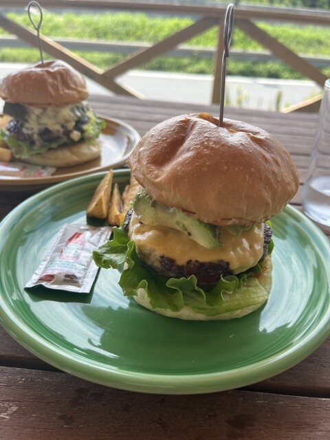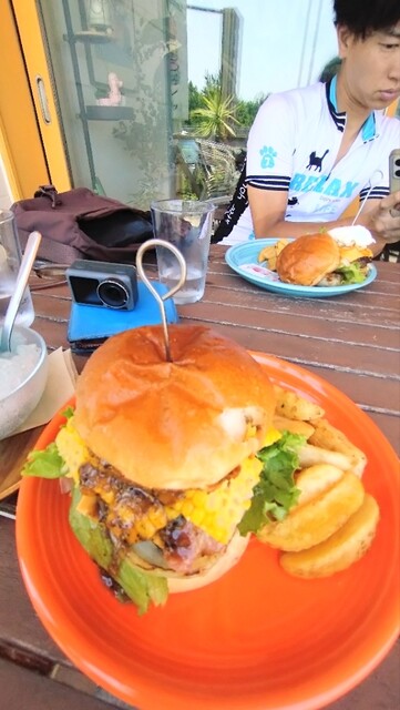 海の見え、オシャレな雰囲気のあるテラス席でペット同伴で訪れました。とても日差しが強く猛暑だったため、店員さんがとても優しい方で、うちのわんちゃんに冷たい水を持ってきてくれました。とても活気があり、夏の雰囲気にぴったりのハンバーガー屋だと思いました。