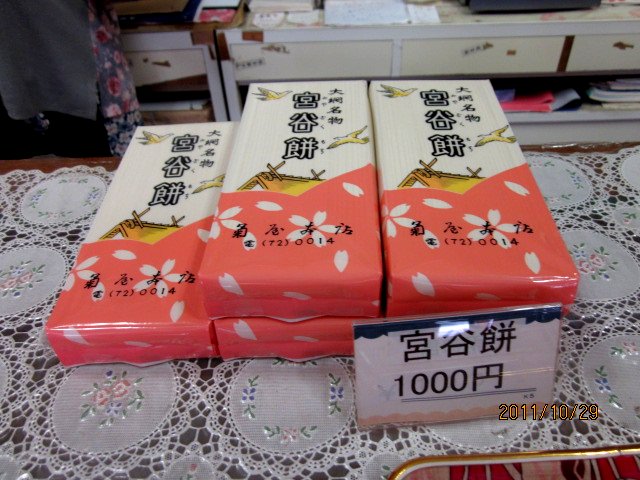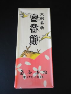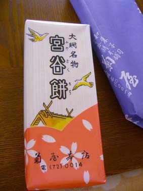 旧大網駅の近くに老舗の「菊屋」さんを発見し、いざ来店。入口には、大きな幟に大網名物 宮谷餅が…。