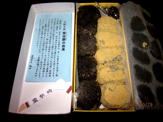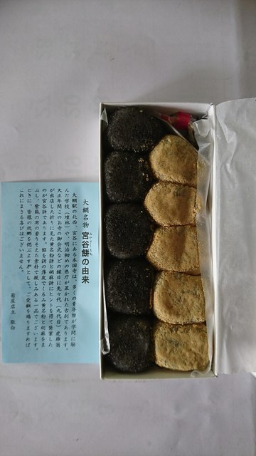 幟を見ながら、入店するなり、宮谷餅が展示されていて他の和菓子は何も無く、少しガッカリしながら宮谷餅を購入しました。価格は、きな粉と胡麻が各5個入って1セットで1,...