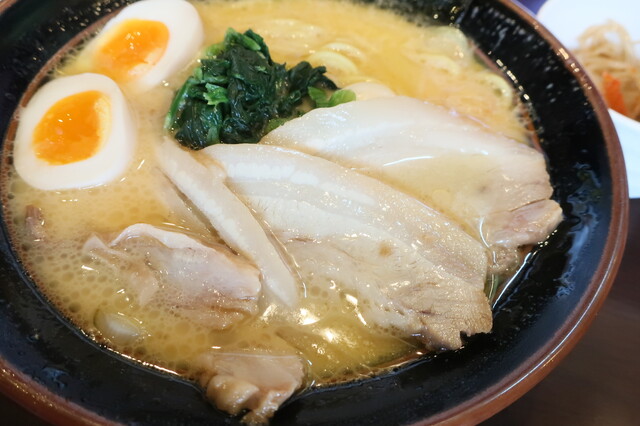チャーシュー、うずらの卵、ほうれん草、海苔がトッピングされています。