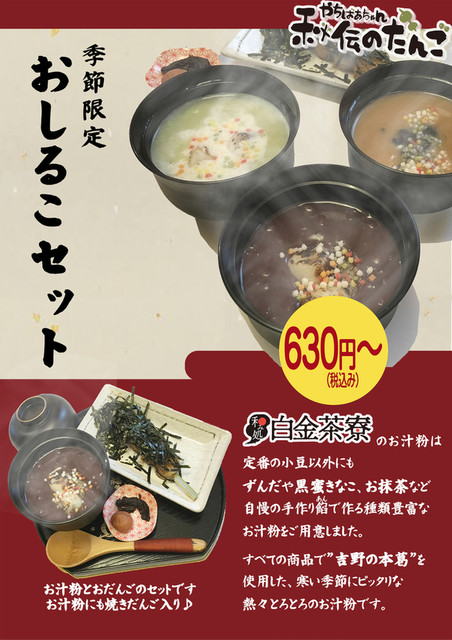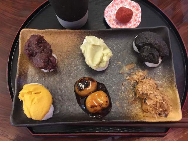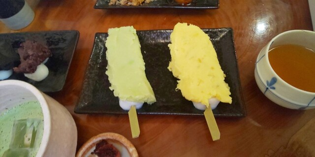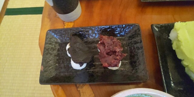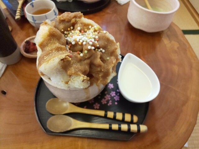 メニューから団子は「みたらし」「スイートポテト」「ずんだ」、かき氷は「黒蜜きな粉」「粒々いちごのミルク」(お任せのお団子付き)を注文します。