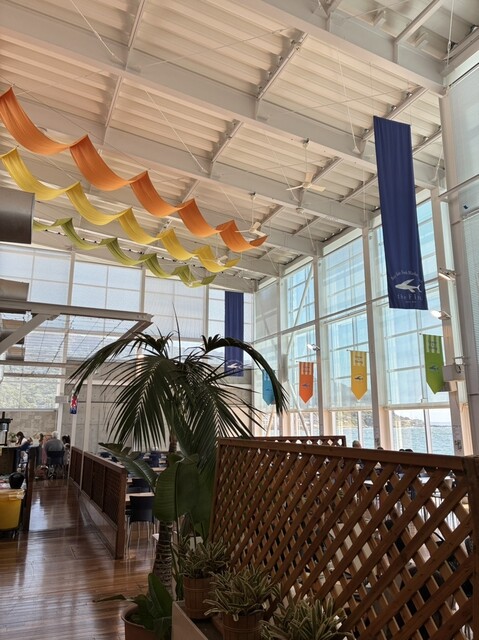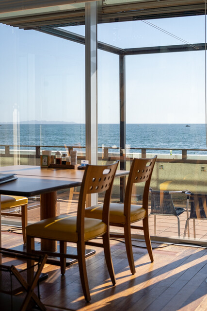 天井の高い開放感あるガラスの建物目の前は海の絶景レストラン