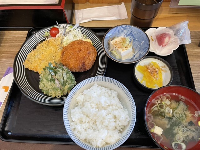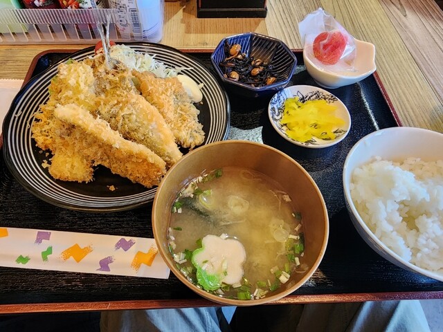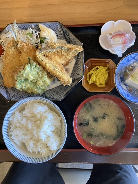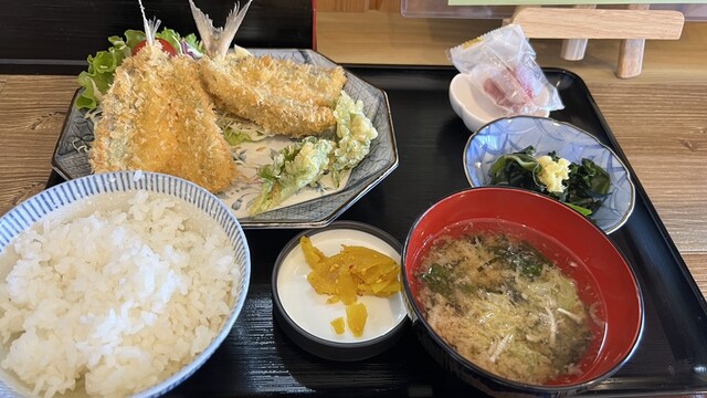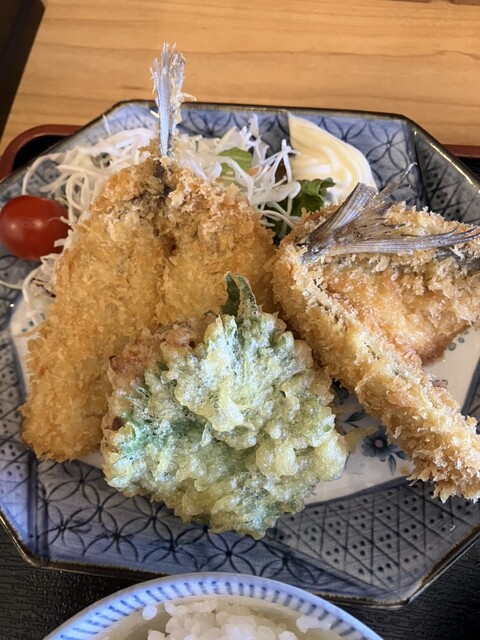 アジフライ•なめろう天麩羅・イカメンチ定食を頂きました。添付の画像にはないメニューがあり、¥1,500でした。 正直なところ、予定は某近隣にあるお店に行く予定でしたが、開店前にも... 詳細を見る