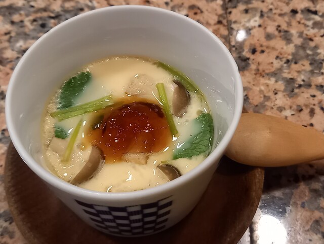 先に厚揚げ煮や茶碗蒸しが出てくる。