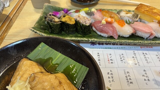 創業明治2年の南房総市最古の寿司店です。千倉で水揚げされた新鮮な地魚をに扱った「寿司と地魚料理」のお店。元祖の『なめろう』や『さんが焼き』などの郷土料理他、漁師料理や珍しい地魚、マンボウやクジラなどがメニューに載ることもありますので、お楽しみに! 女性同士やお子様連れのご家族も大歓迎! メニューには全品価格表示されていますので、好きな物をたくさん召し上がれる安心店です。春は「お花摘み」「いち...