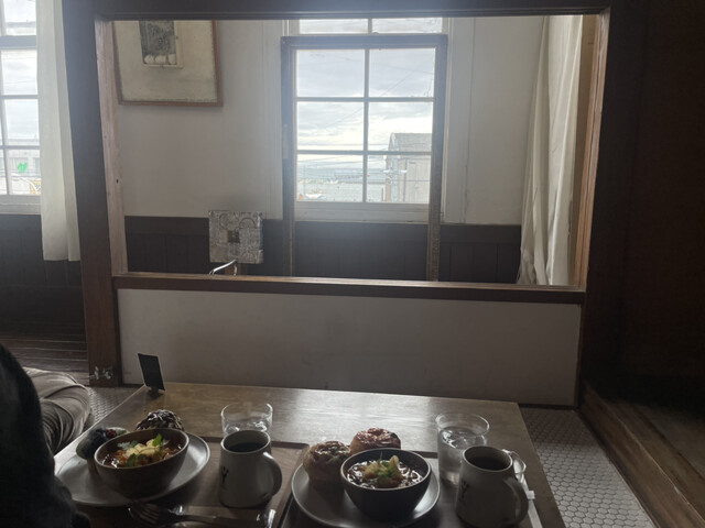 6月の土曜日の13時、館山で人気のカフェにいきました。雨が降ったり止んだりの天気のお陰で、2階の席に座ることができた。