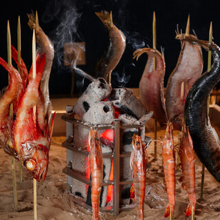 我们使用围炉,利用我们自己的感受,提供滨名湖和当地食材。 新鲜的鱼是原始烧烤;鳗鱼、牡蛎和蔬菜是用木炭烤的。