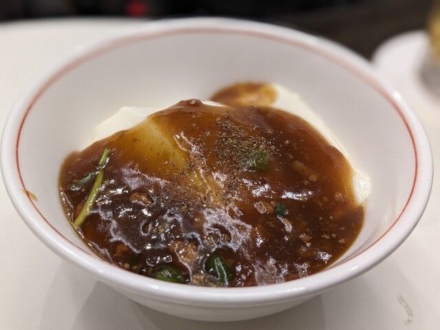 豆腐是现蒸的热豆腐,配有两种酱汁:麻婆酱和海鲜咸味酱。