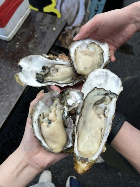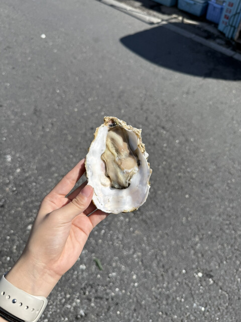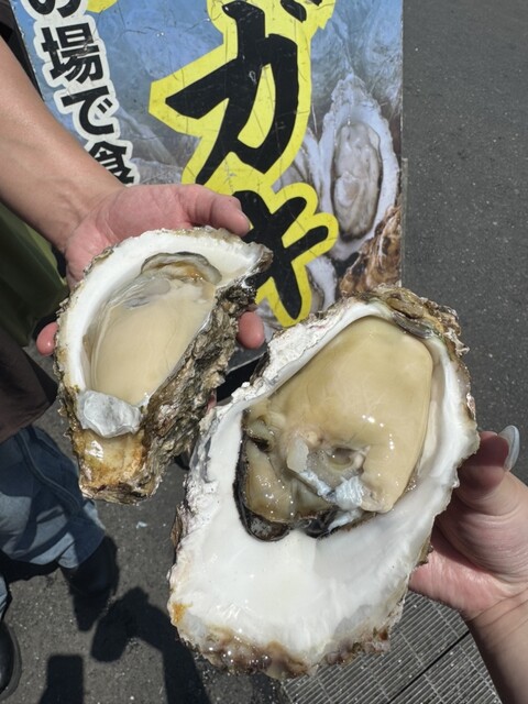 大约在早上11点到达市场。虽然排了很长的队,但我实在太想吃了,所以还是排队了(大约10到15分钟)。我点了生蚝(500日元)和岩蚝(500日元)。它们的大小让我一口吃不下,肉质鲜嫩,真是太好吃了。绝对...