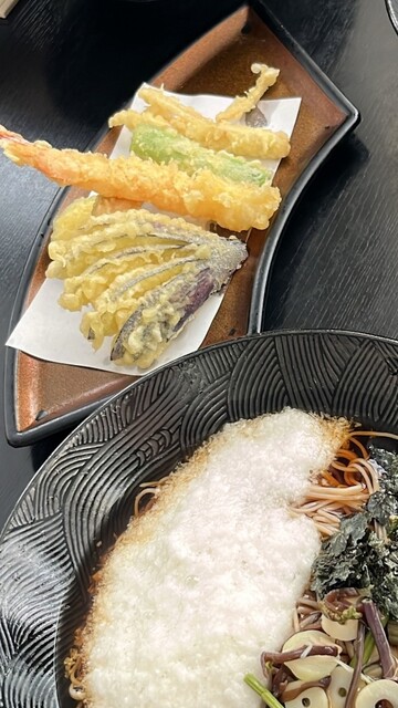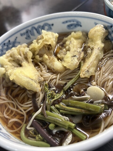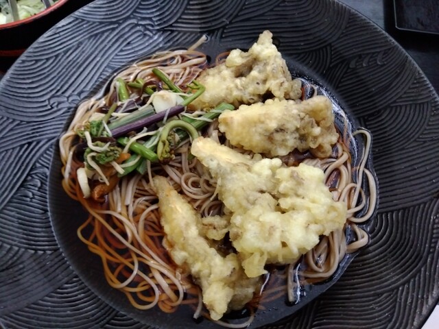 因为原本想去的『川上庵』排队太长,所以我走了几步来到了这里。舞茸天的外衣比较厚,口感松软,与荞麦面的搭配也很好,配菜的山菜味道调味得恰到好处,令人满意。