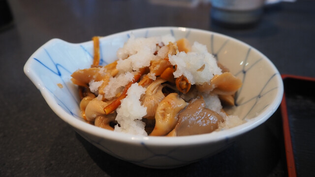 总之先填饱肚子,于是我来到车站附近的这家店。打开门,坐到了空位上。没有特别的问候,湿毛巾就自然送上来了。感觉就像是来到了乡下朋友家一样。我点了一份山菜...