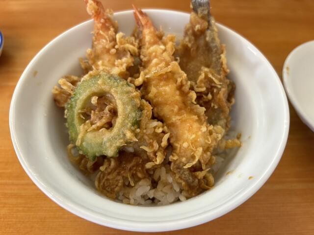 轻井泽在工作日也很热闹,但由于我提前入店且只有一个人,立刻就坐到了吧台位。三位年长男性在操作,非常热情地欢迎了我。午餐限定的招牌天丼1400日元,配有2只虾、1条吻仔鱼、1只小鱿鱼和1根苦瓜。味道普通...
