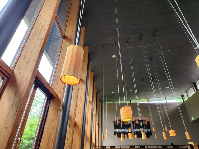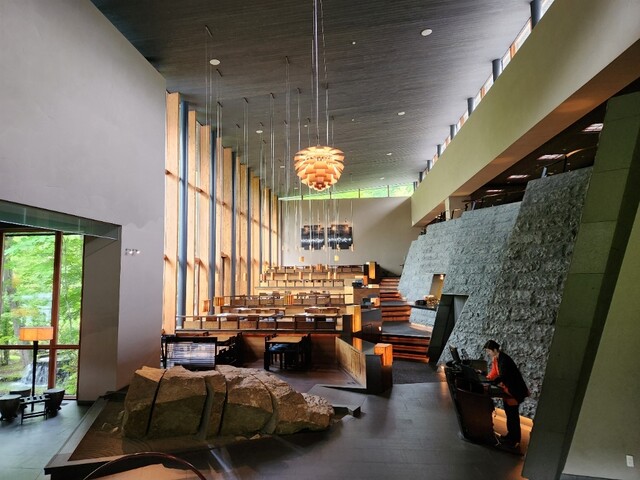 空间天花板很高,玻璃墙外是美丽的梯田,环境非常舒适。