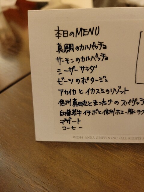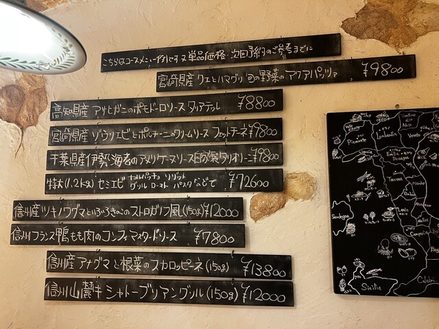 信州产的品牌肉类和蔬菜,渔民直送的新鲜鱼类和海鲜,约1000种意大利葡萄酒 仅接待提前一天预约的顾客,提供的菜品为主厨推荐套餐,价格为6600日元、8800日元、11000日元和14300日元(根据季节可能会有所变动)。在您预约后,我们会根据您的需求定制菜品。店内有约1000种意大利葡萄酒(包括多款陈年老酒)。有关食材和预约咨询的信息,请查看我们的网站,以便参考预约。 |