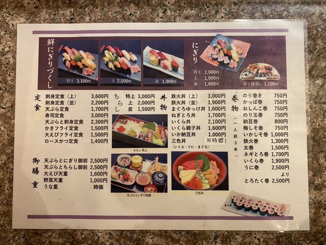 我不太擅长坐榻榻米,所以选了桌子坐下,首先盯着菜单看。午餐菜单包含寿司、丼饭和定食各类,...