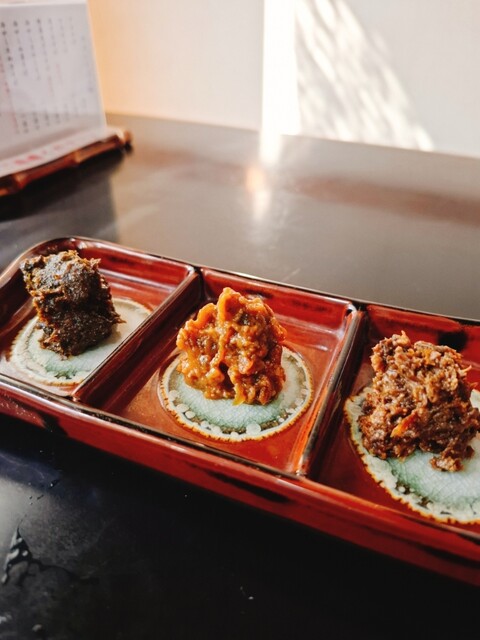 小吃的三种味噌酱真是太好吃了,分别是蕗味噌、大叶味噌和辣味噌,真想一边慢...