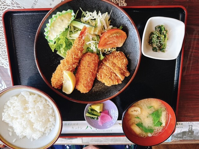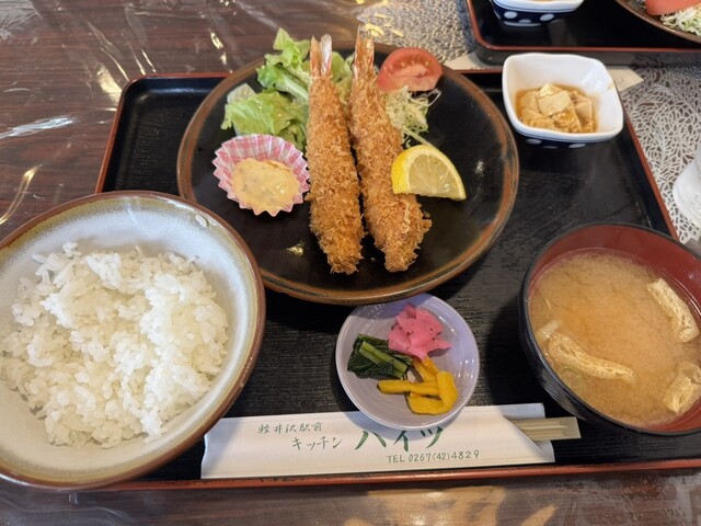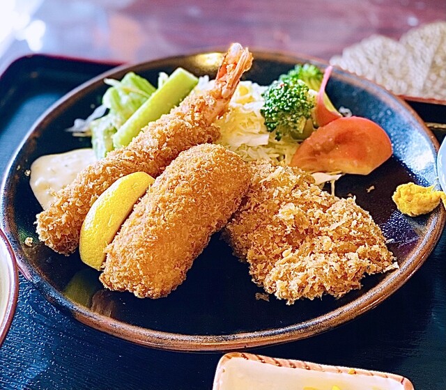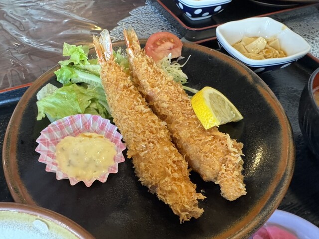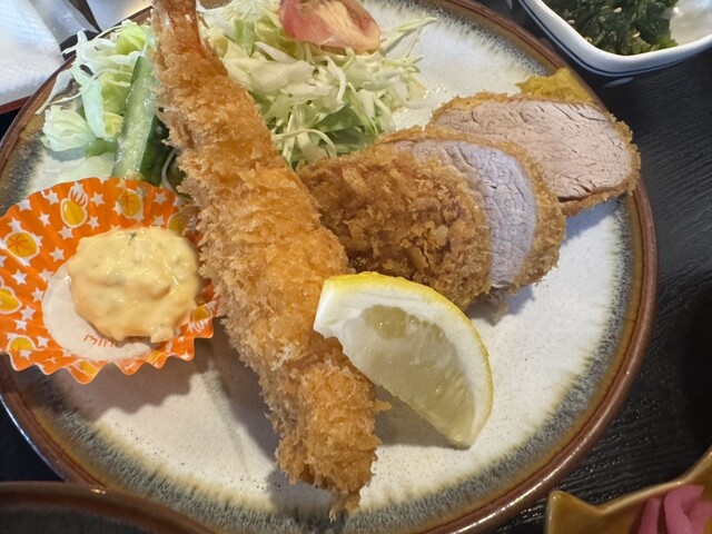 虾炸得外脆内嫩,个头大且多汁。里脊炸猪排柔软,完全没有油腻感...