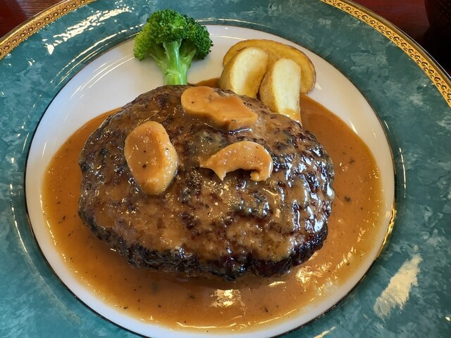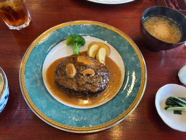 我在もりもり亭享用了汉堡定食。端上来的盘子放在美丽的木纹桌上,虽然简单却很有存在感,让人不禁感到高兴。大块的汉堡肉松软多汁,切开后肉汁缓缓流出,浓郁的味道在口中扩散,搭配适度的甜味和浓厚的酱汁,非常美...