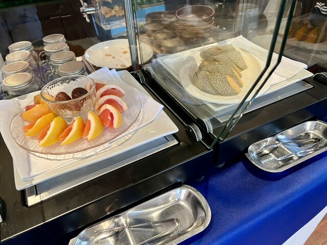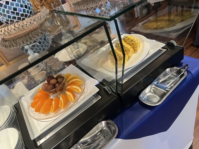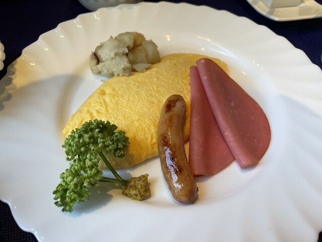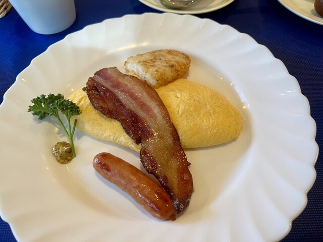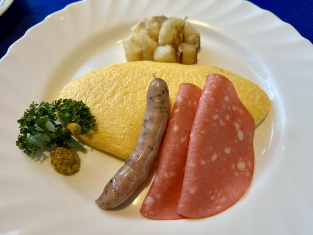 这是我在酒店住宿时享用的早餐。我在煎蛋和炒蛋之间犹豫,最终选择了炒蛋。还有香肠和色彩鲜艳的火腿,真是典型的西式早餐,面包也可以随意吃,真让人开心。