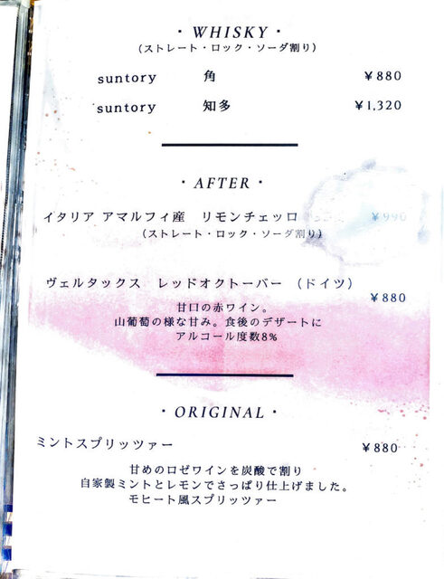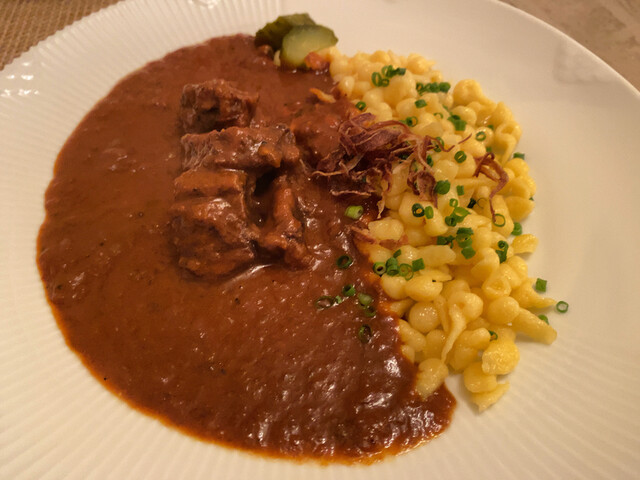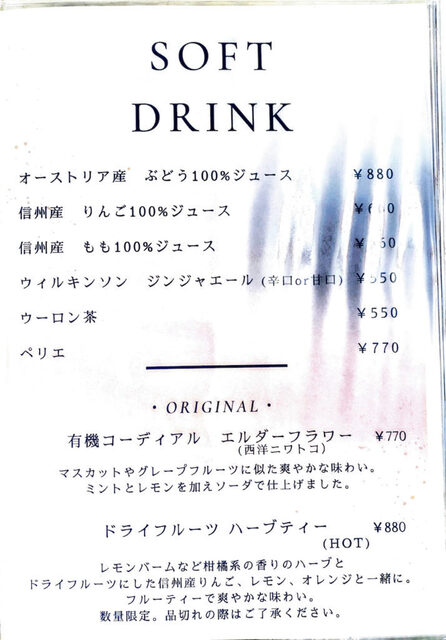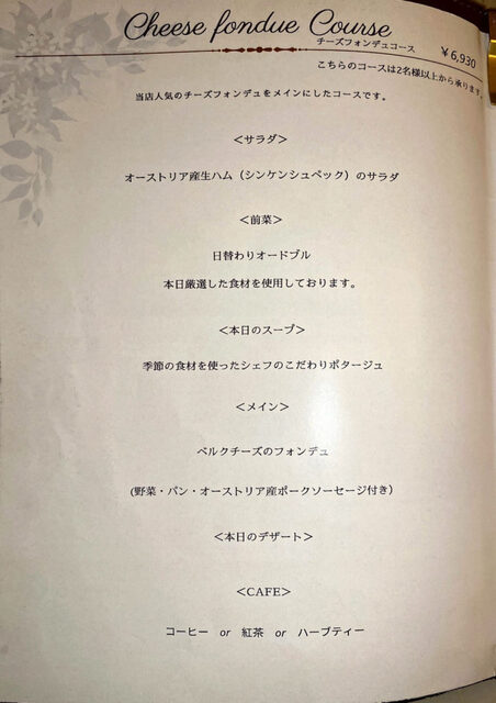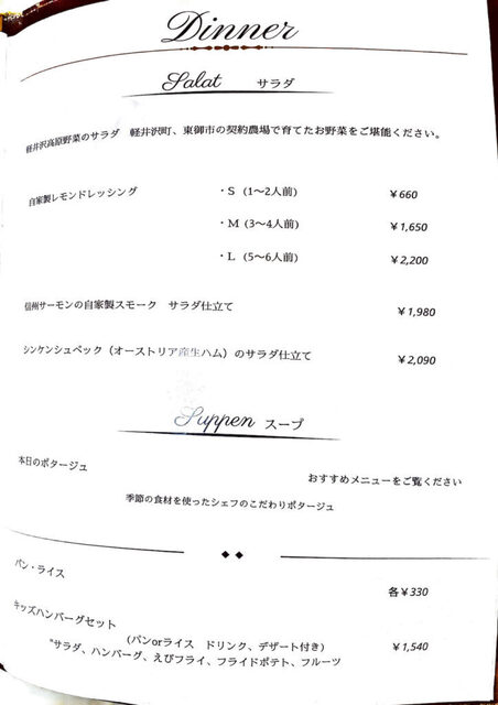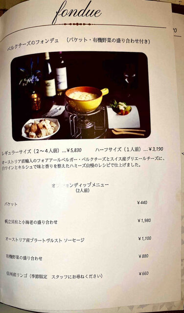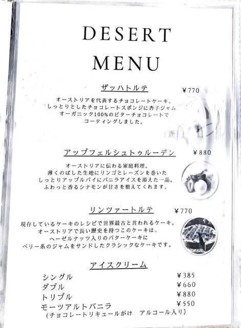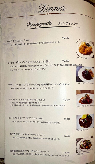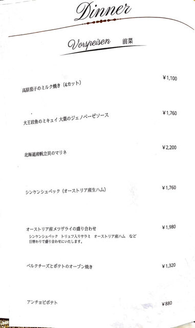 菜单上提供了继承自奥地利布雷根茨的主厨方的各式中欧传统乡土菜。似乎从当地调配山奶酪和小麦粉,并使用“RO纯水”进行烹饪,以保持素材的原汁原味。用香气四溢的奶酪搭配的生面条和炖牛腱肉为招牌菜。