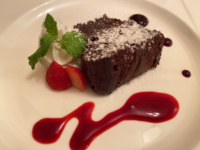甜点是「生巧克力风味的巧克力蛋糕」(含税715日元)。外层是湿润的巧克力蛋糕,中心浑厚的生巧克力满满。一口咬下去,滑腻和甘甜的口感在舌尖化开,浓郁的巧克力风味激发了所有感官。