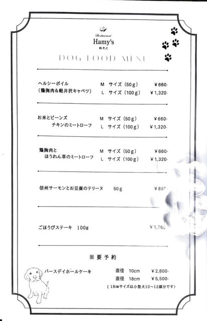 还有为狗狗准备的菜单,包括「健康蒸制(鸡胸肉&轻井泽卷心菜)」、「米饭和豆类鸡肉肉饼」、「鸡胸肉和菠菜肉饼」、「信州三文鱼和豆腐的慕斯」、「奖励牛排」、以及需要预约的生日蛋糕共六种菜肴。
