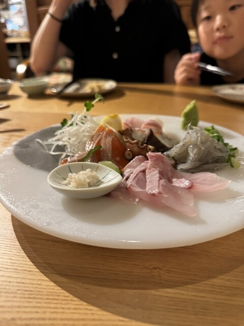 ・前菜(550日元)×4/儿童座位费(100日元)×2/松露盐炸穴子天(880日元)/刺身三种拼盘(1,400日元)/有马青椒煮穴子土豆沙拉(660日元)/新姜苹果沙拉(600日元...查看详情