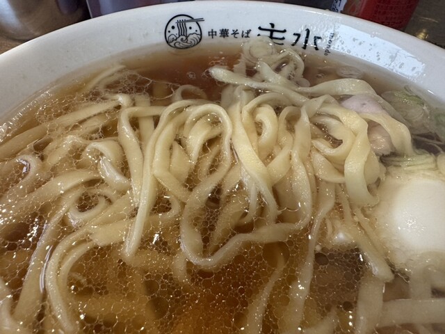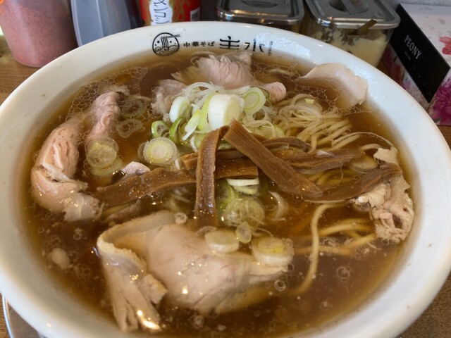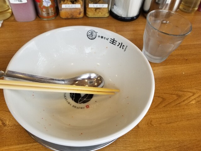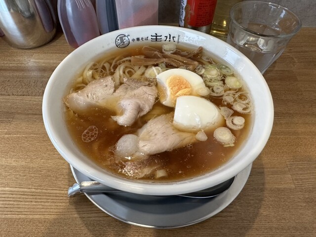 我去了御代田町的“主水”。点了沾中式拉面(950日元)。我以为是沾面,结果面条煮得很快,让我有些疑惑。果然,这不是沾面,而是将中式面条放入汤里吃的风格。